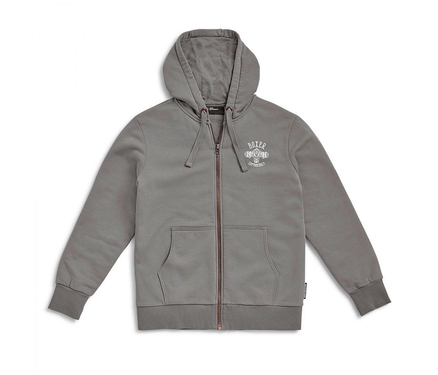 Στις κρύες ημέρες, το Zip-Hoodie Mechaniker είναι ευχάριστα ζεστό και προσφέρει με τις τσέπες στην κοιλιά χώρο για κρύα χέρια. Το Hoodie γενικής χρήσης για γυναίκες και άνδρες από βαμβακερό Jersey είναι βουρτσισμένο εσωτερικά και φέρει τη στάμπα ενός κινητήρα boxer στο στήθος και την επιγραφή "Mechaniker" ή/και "Mechanikerin" στην πλάτη.