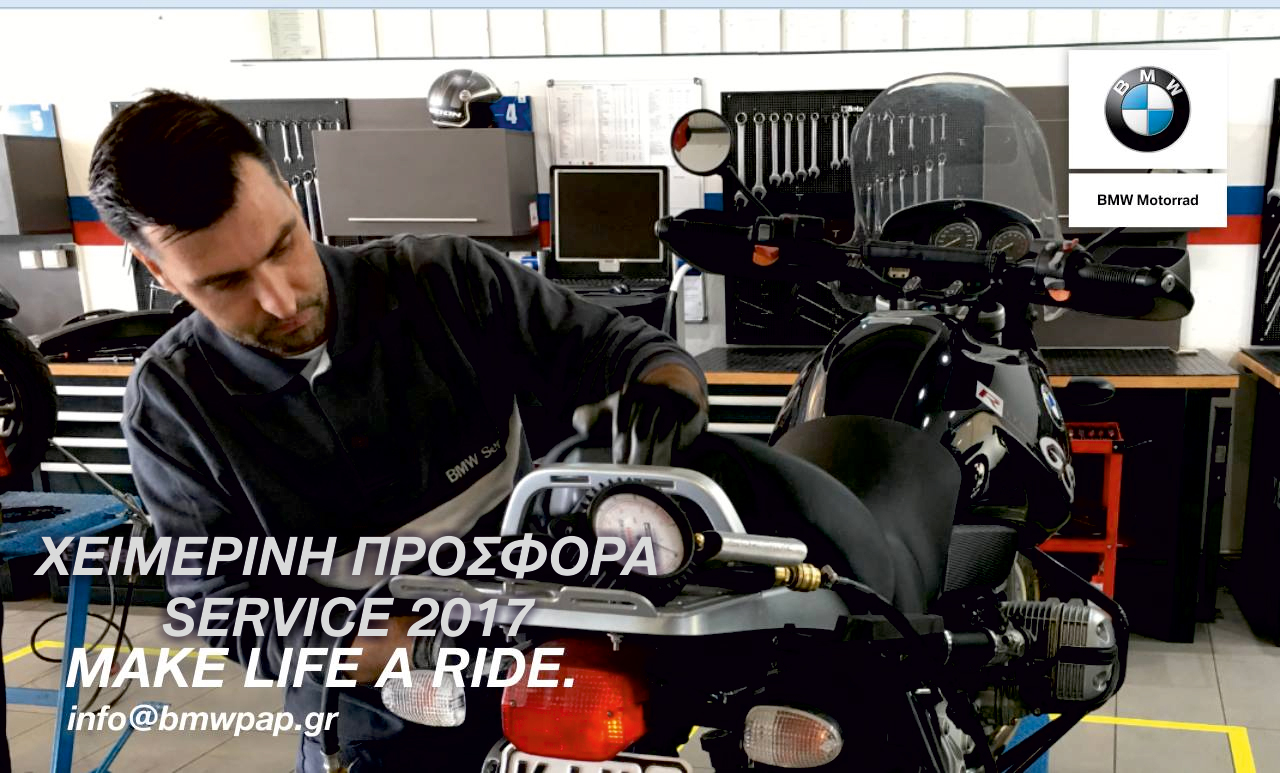 Χειμερινή προσφορά BMW Motorrad Service 2017-2018! Επωφεληθείτε 20% έκπτωση στα ανταλλακτικά-λιπαντικά και 10% στην εργασία. Με 2 χρόνια εγγύηση στα ανταλλακτικά και την εργασία. Δυνατότητα πληρωμής και με άτοκες δόσεις με πιστωτική κάρτα. Ισχύει έως 28/02/2018.